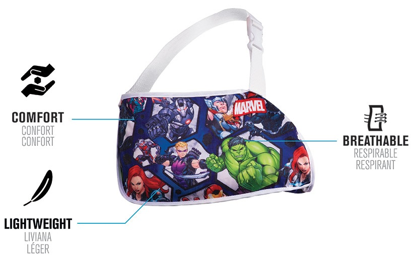 The Donjoy® Advantage Youth Arm Sling Featuring Marvel provides mild arm support and a Marvel Super Hero design.