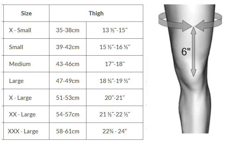 The measurement should be taken around the thigh, i.e. 15cm (6") above the patella (knee cap) mid-line.If your sizing falls between measurements, please select the next size up.