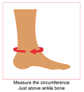 Circumference of ankle, measured above the ankle bone, see image below